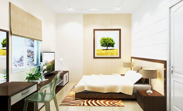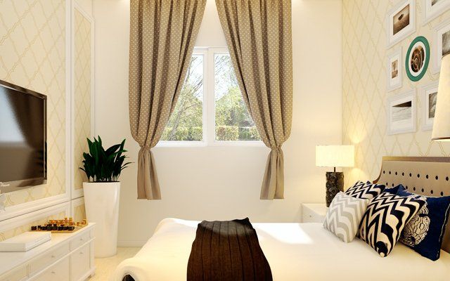 Màu tường nhạt kết hợp với rèm cửa họa tiết nhã nhặn cũng giúp căn phòng sang trọng và ấm áp hơn.